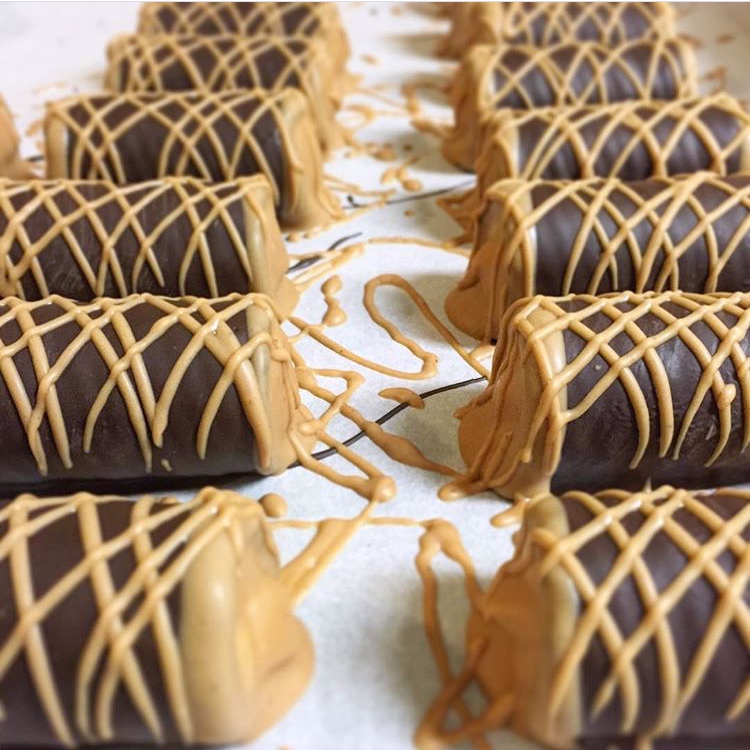 Rows of chocolate dipped cannoli wafers filled with- u guessed it! That good ‘ol crunchy peanut butter mousse- ends then dipped and drizzled with peanut butter chocolate