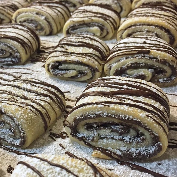 Rolled rugelach filled with chocolate spread, dusted with confectioners sugar and splattered with chocolate ( I needed some snow already 🙂 so the recipe is from Mrs Bresher and from my good ‘ol days of being a baking assistant in machane atara… Recipe: